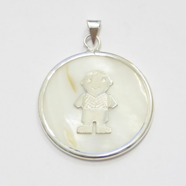 UncategorizedColgante redondo de nacar con 30.90 mm de diametro con un niño en el centro.