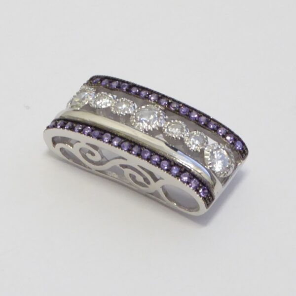 Colgante rectangular, con circonitas blancas y moradas. Los laterales calados con filigrana.