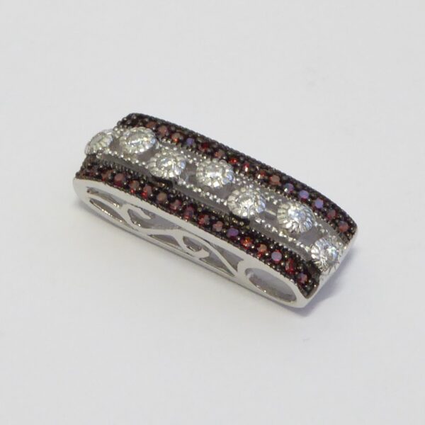 Colgante rectangular, con circonitas color rubí y blancas . Los laterales calados con filigrana.