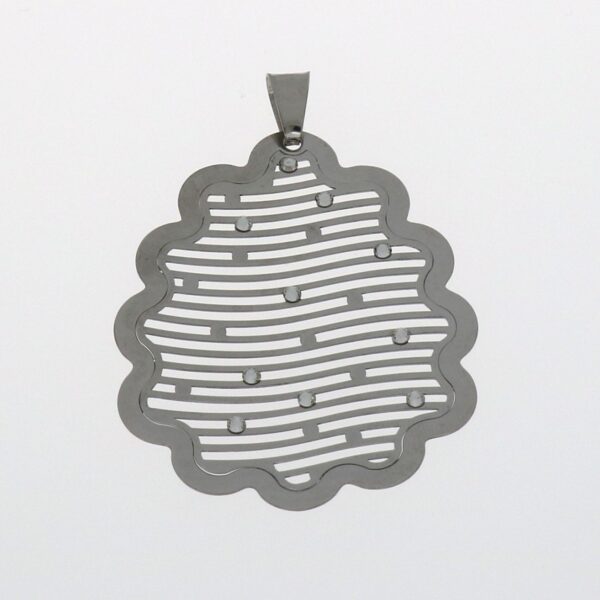 Colgante rodiado con circonitas de 2mm y satinado por la parte posterior. 49.75 mm de largo y 39.50 mm de ancho.