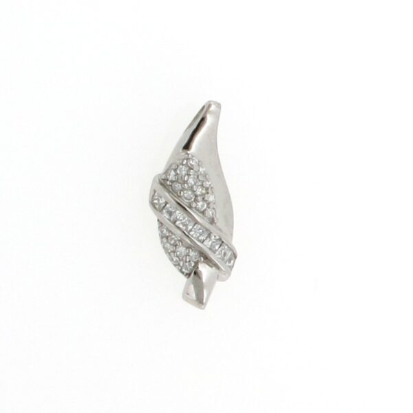 Colgante rodiado, que combina circonitas blancas con partes lisas. 26 mm de largo y 10.50 mm de ancho.