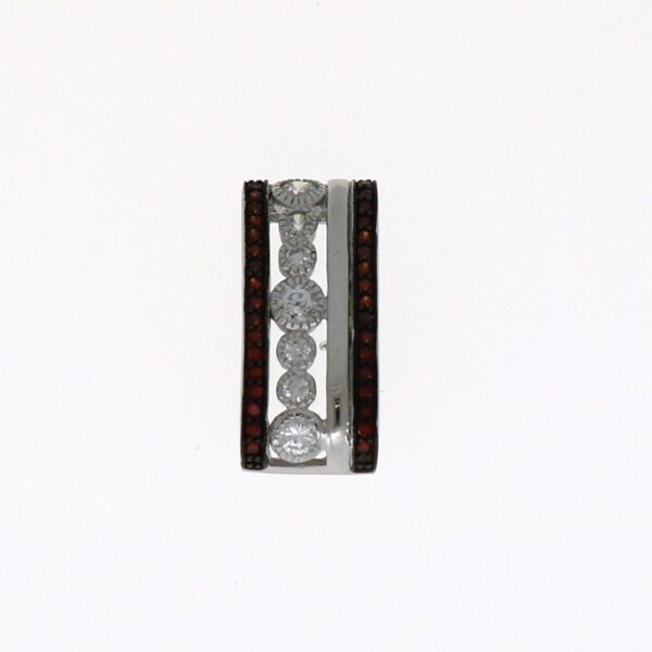 Colgante rectangular, con circonitas color rubí y blancas . Los laterales calados con filigrana.