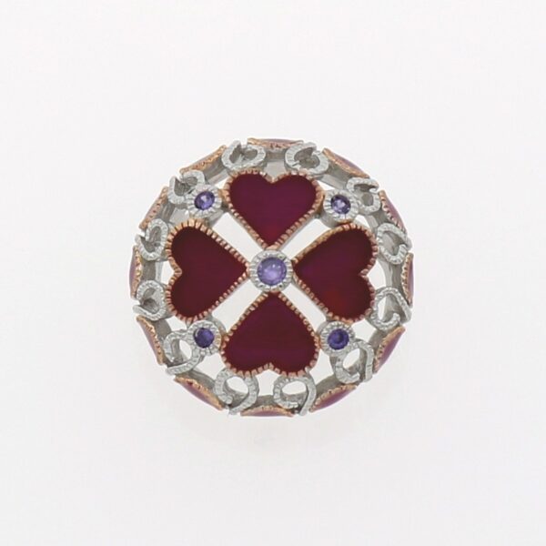 Colgante circular de filigrana. Con corazones esmaltados en fucsia y circontitas en colo amatista. 22.65 mm de diámetro.