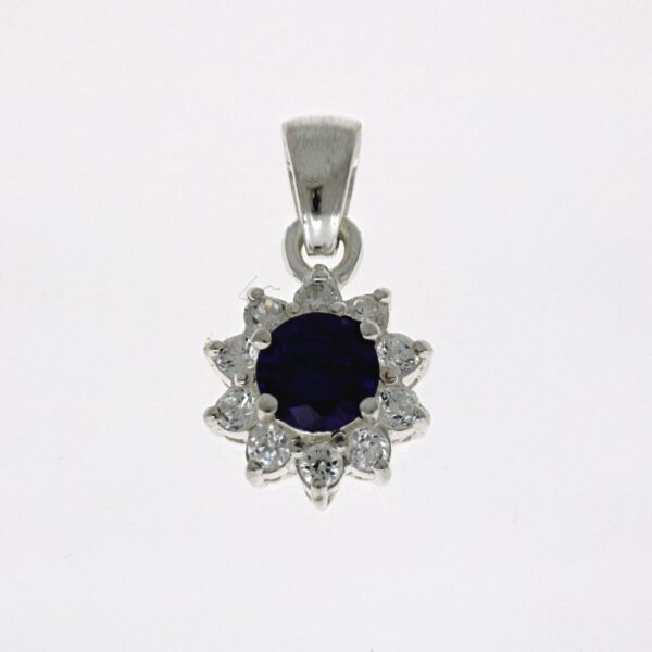 Colgante con circonita redonda, de color amatista. Rodeado de circonitas blancas. 17.90 mm de largo y 13.15 mm de ancho.