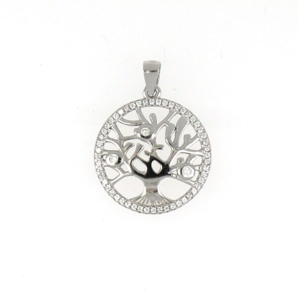 Colgante circular del árbol de la vida. Rodeado de circonitas de 1 mm y de 2 mm en las ramas. 20.65mm de diámetro.