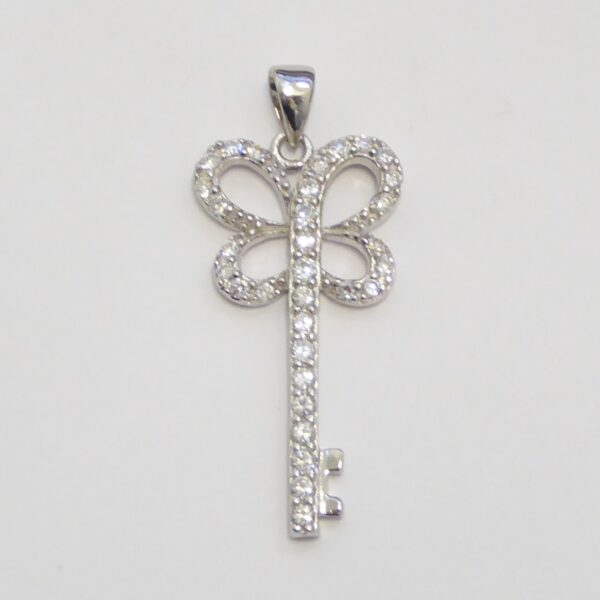 UncategorizedColgante de llave con circonitas. Formando la parte superior dos alas de mariposa.34.20 mm de largo y 17 mm en su parte más ancha.