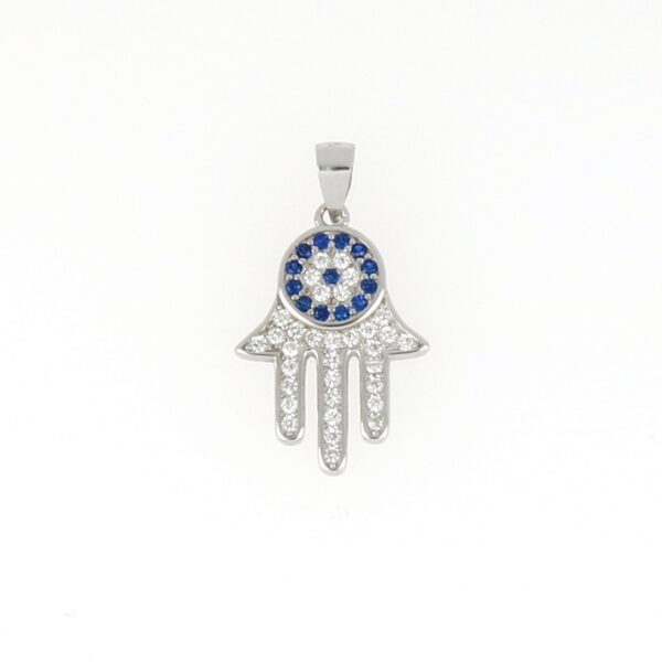 Colgante de la Mano de Fátima con circonitas en azul y blanco. 22 mm de largo y 15.50 mm de ancho.