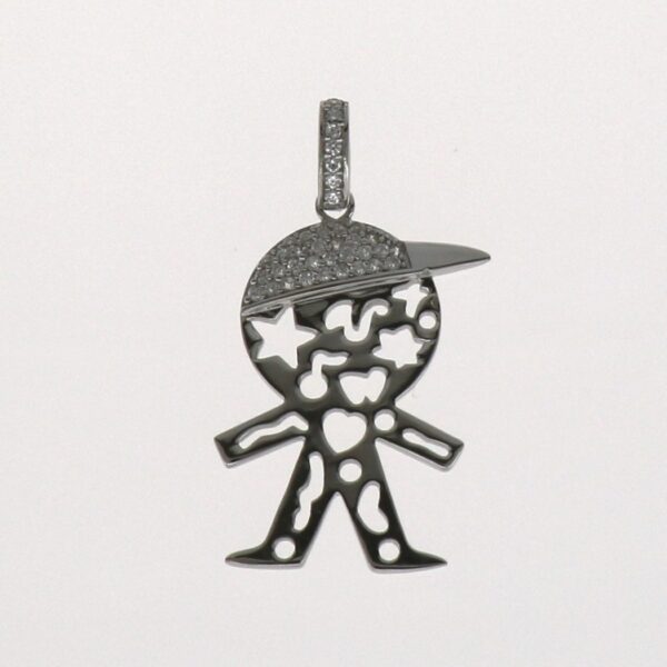 Colgante niño con circonitas en la gorra y calados en el cuerpo. Formando estrellas y corazones. 31.30 mm de largo y 21 de ancho.
