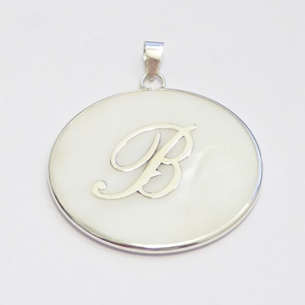 Colgante redondo de nacar con 40.85 mm de diametro y la inicial B.