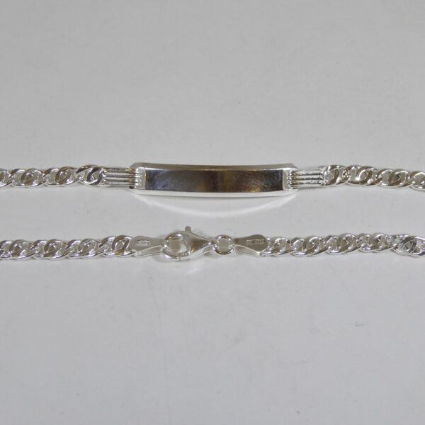 Esclava de eslabón de cadena barbada. Placa de 5 mm de ancho y 2.5 cm de largo. Esclava de 19.5 cm de largo. Plata de ley de 925 milésimas.