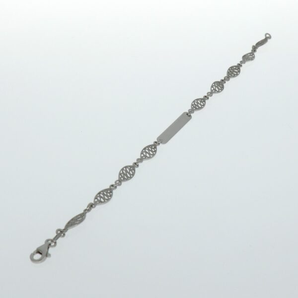 UncategorizedEsclava con eslabones ovalados calados de 5.25 mm de ancho con placa rectangular de 24.55 mm de largo y 4 mm de ancho.