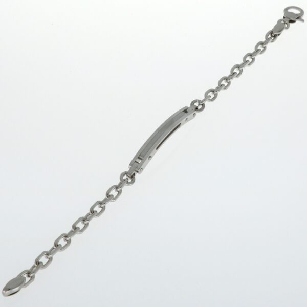 Esclava rodiada con eslabón rectangular de 7.75 mm. Placa hueca satinada en el centro de 5 cm de larga y 5.15 mm de ancha. Cierre de mosquetón y 20.5 cm de largo. Plata de ley de 925 milésimas.