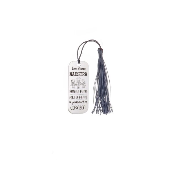 62 mm de largo y 25 mm de ancho, borla gris y con grabado:
