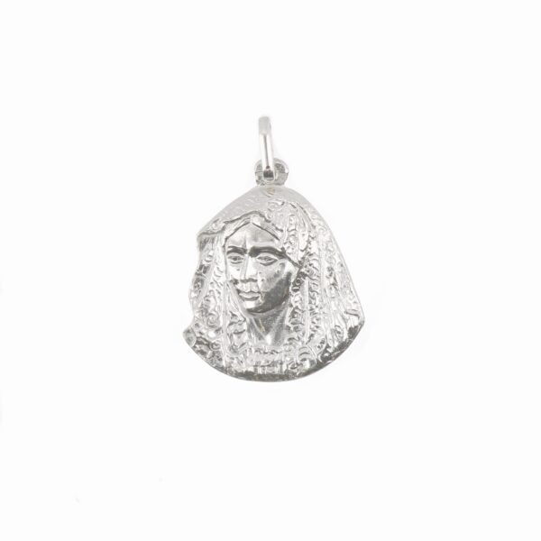 Medalla de la Virgen de la Macarena con mantilla y asa redonda. 18,5 mm de largo y