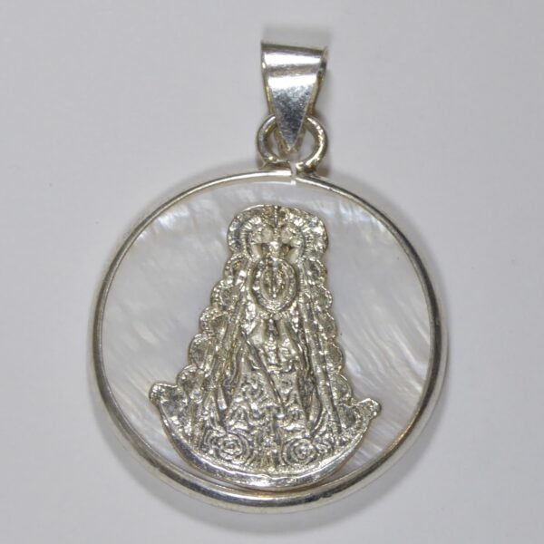 UncategorizedMedalla de la Virgen del Rocio. En placa redonda de nacar con 26.25 mm de diámetro.