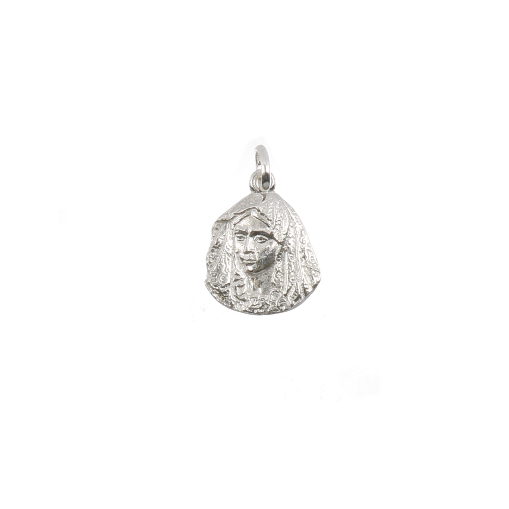 UncategorizedMedalla de la Virgen de la Macarena con mantilla y asa redonda. 20.75 mm de largo y 16.40 mm de ancho.