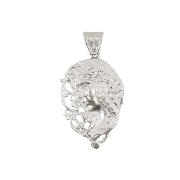 UncategorizedMedalla de la Virgen de la Macarena. Doble cara, con mantilla y asa tallada.37 mm de largo y 24.75 mm de ancho.