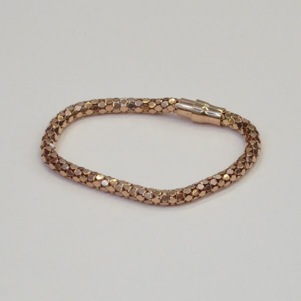 Pulsera de malla en color cobre diamantado . De 5 mm de diámetro y 20 cm de largo. Con cierre de imán. Plata de ley de925 milésimas.