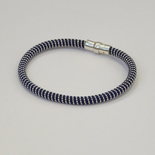 Pulsera de malla de tubo en color azul marino. De 4.80 mm de diámetro y 19.5 cm de largo. Con cierre de imán. Plata de ley de 925 milésimas.
