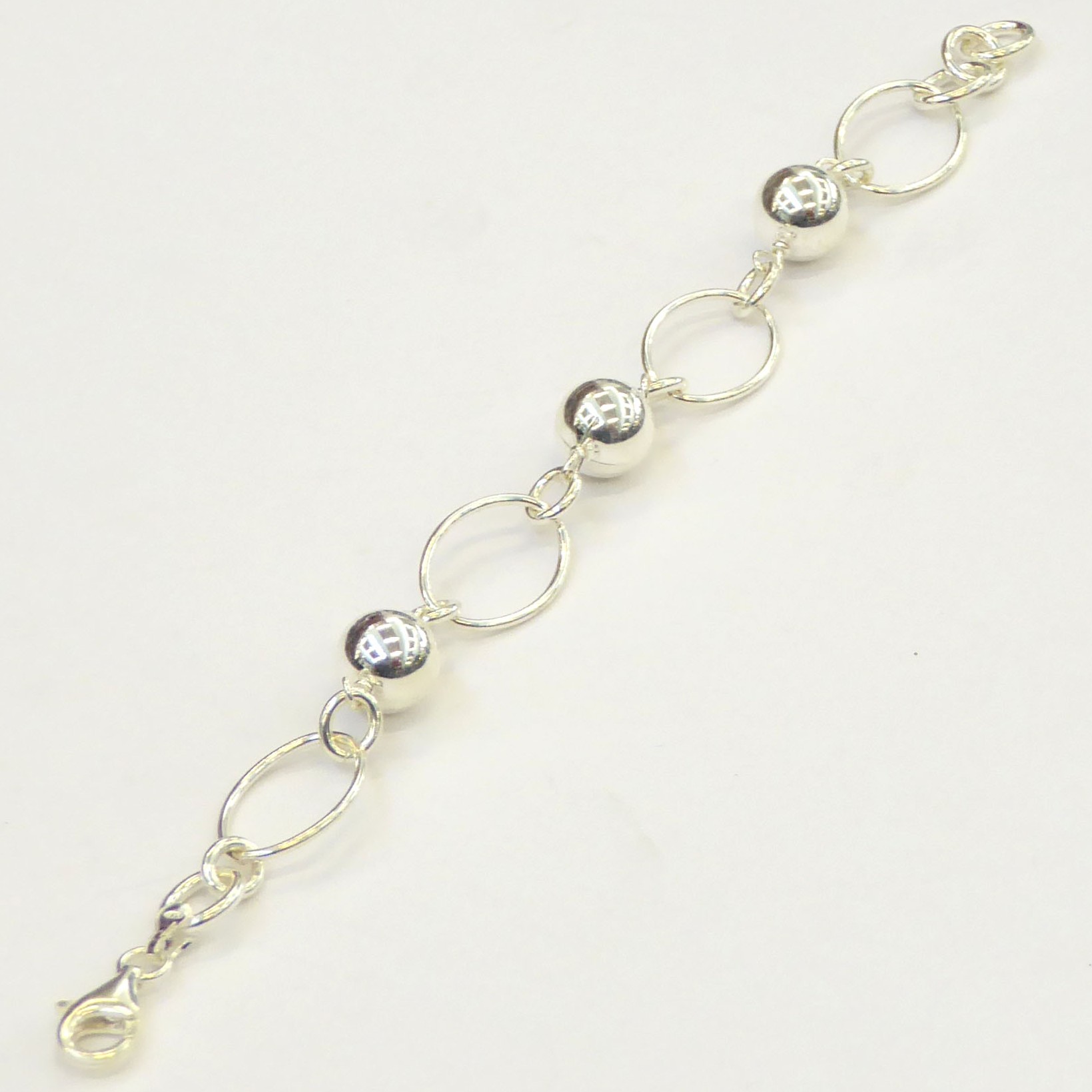 Pulsera hueca que combina eslabón ovalado con bola lisa de 10 mm. 19.5 cm de largo. Plata de ley de 925 milésimas.