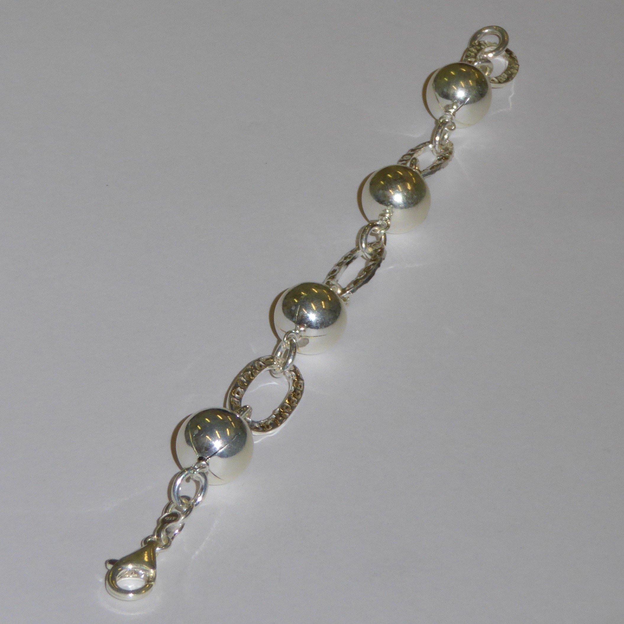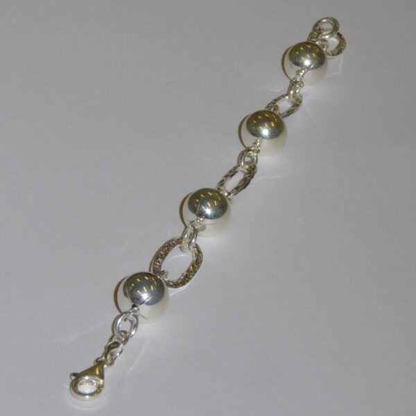 Pulsera hueca que combina eslabón plano tallado, con bola lisa de 12 mm. 19.5 cm de larga. Plata de ley de 925 milésimas.