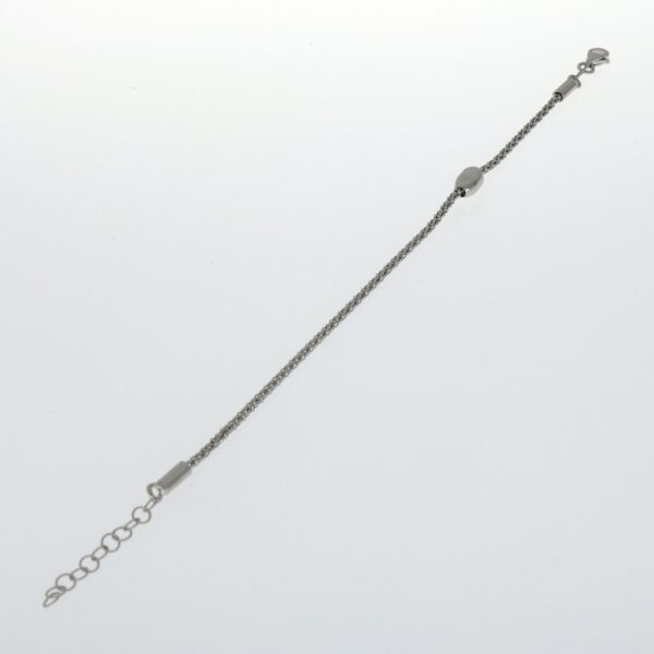 UncategorizedPulsera rodiada de cadena coreana de 1.90 mm de grosor y bola ovalada de 5.30 mm. 17 cm de largo y 2.5 cm de alargador. Plata de ley de 925 milésimas.