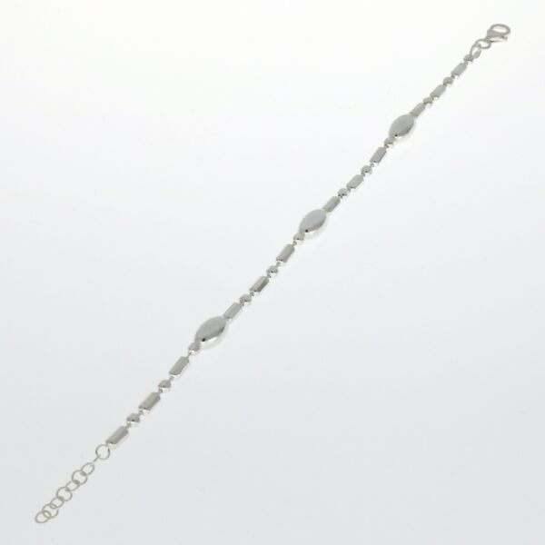 Pulsera rodiada de bolas de 3 mm y ovaladas de 6 mm . 17.5 cm de largo y 2 cm de alargador. Plata de ley de 925 milésimas.