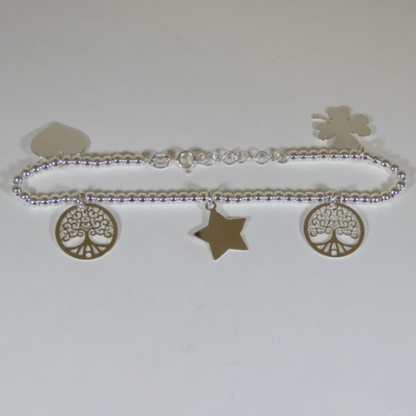Pulseras, Sin piedrasPulsera de bolas de 3 mm . Con colgante lisos de estrella, trebol, corazón y arbol de la vida.De 15 mm de ancho y 15 mm de largo. Largo de la pulsera 18 cm y 3 cm de largo. Plata de ley de 925 milésimas.