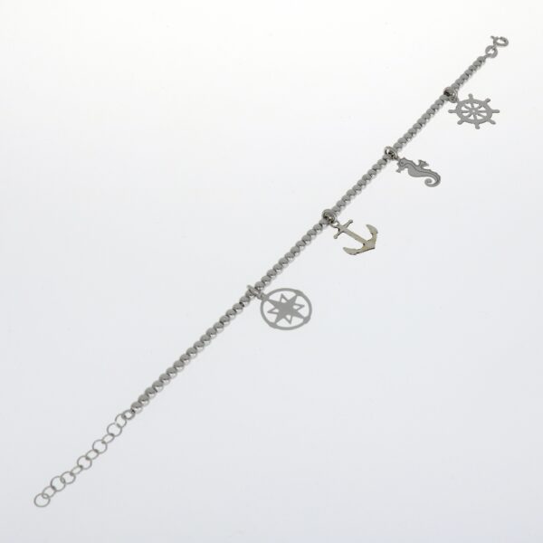 UncategorizedPulsera rodiada de bolas de 3 mm con colgantes de estrella polar, estrella de mar, ancla, caballito de mar y timón. 18 cm de largo y