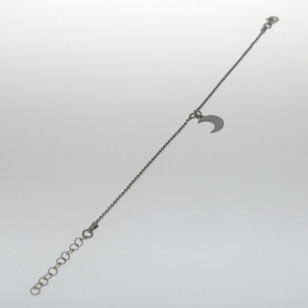 Pulsera rodiada de bola diamantada de 1.50 mm con una luna lisa de 10 mm. 17.5 cm de largo y 3 cm de alargador.Plata de ley de 925 milésimas.