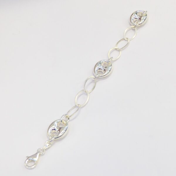 Pulseras, Sin piedrasPulsera hueca con eslabones de calabrote con eslabones ovalados, planos y tallados. 19.5 cm de largo. Plata de ley de 925 milésimas.