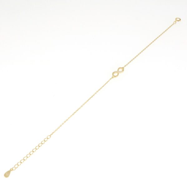 UncategorizedPulsera chapada de cadena forzada de 1 mm. En el centro un infinito que combina parte con circonitas y parte lisa. De 15 mm de largo y 5.10 mm de ancho.