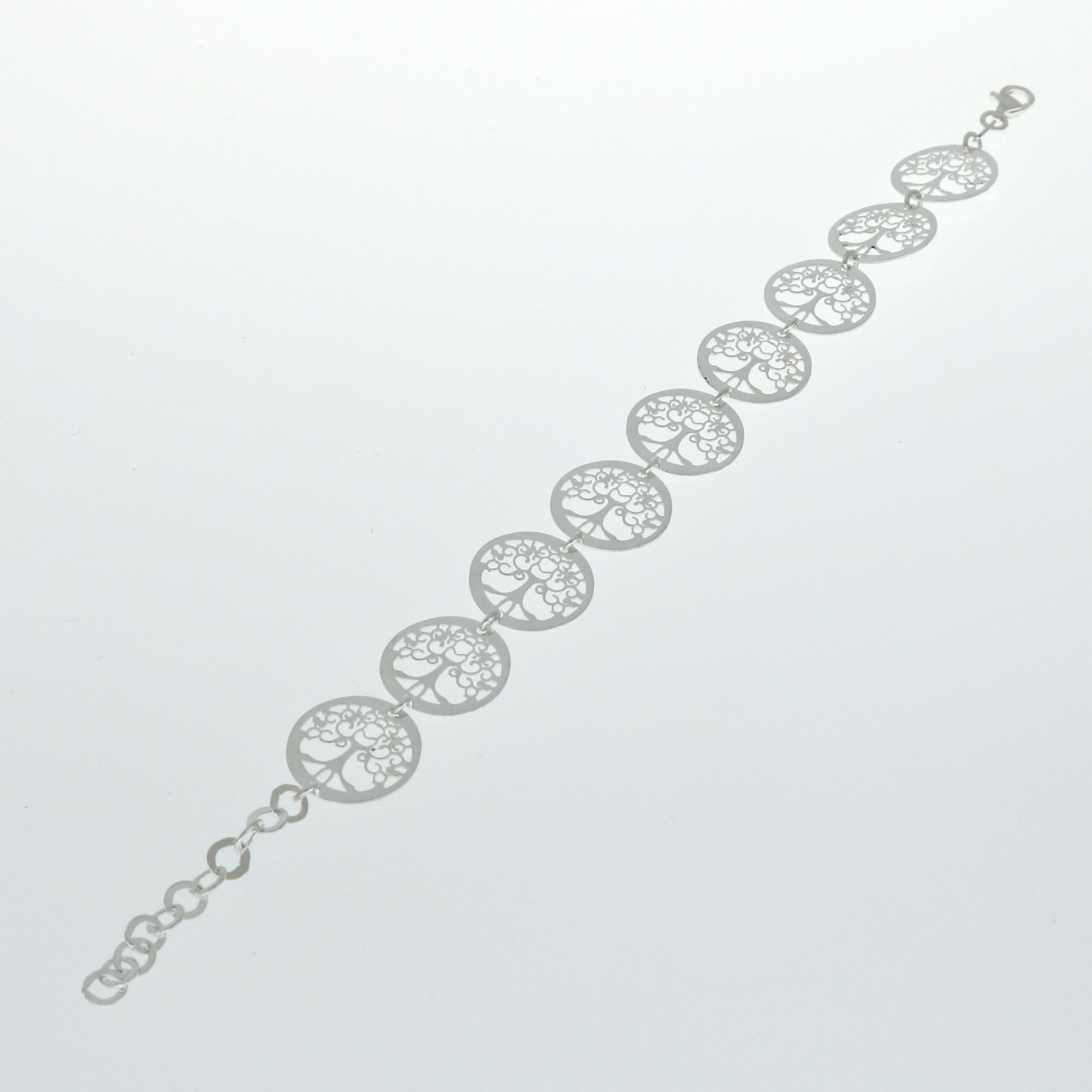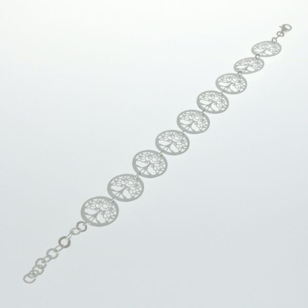 Pulsera rodiada, con nueve placas caladas del árbol de la vida, de 1.5 cm de diámetro cada uno.