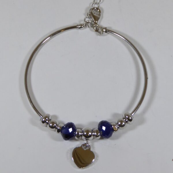 Pulsera rígida de 1.60 mm de grosor y 6 cm de diámetro y 2.5 cm de alargador .Con piedras facetadas en azul y colgante de corazón chapado en rosa. Plata de ley de 925 milésimas.