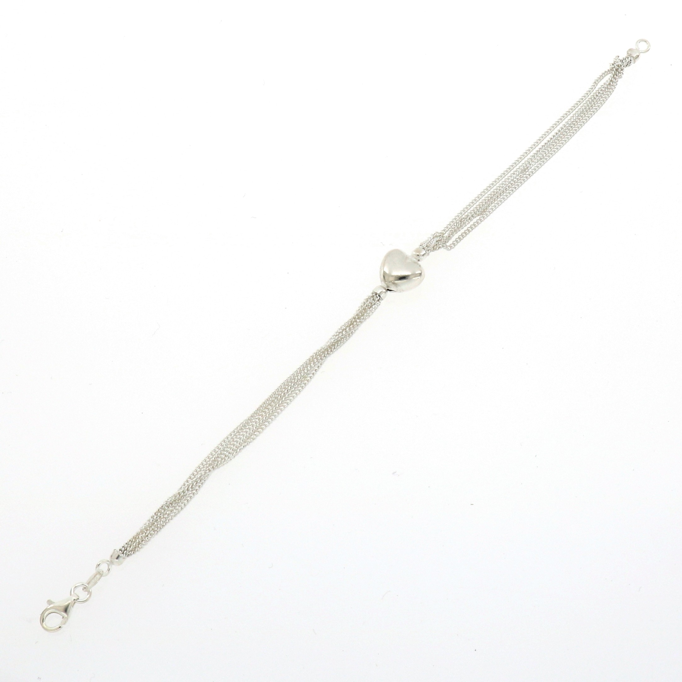 Pulsera con cinco hilos de cadena barbada de 1.25 mm . Con un corazón hueco en el centro de 8.50 mm de largo y 10 mm de ancho.