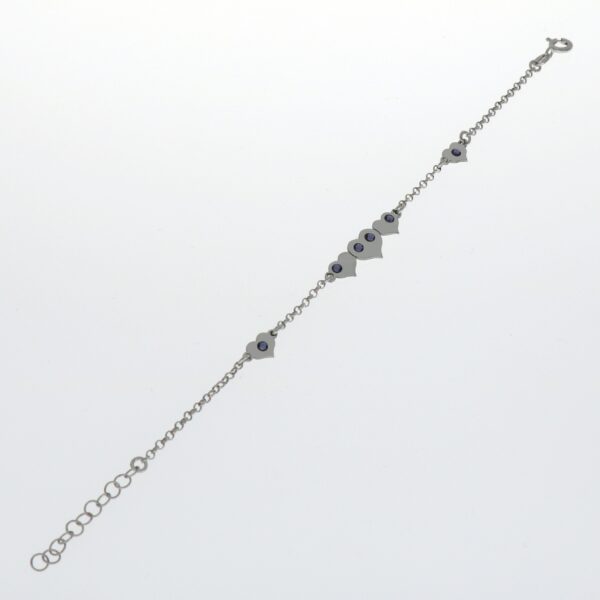 UncategorizedPulsera rodiada, con cadena rolo de 2 mm y corazones lisos con circonitas en lila, de 2.50 mm.Pulsera de 16.5 cm de largo y 3 cm de alargador. Plata de ley de 925 milésimas.