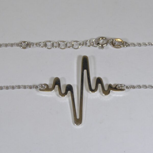 Pulsera de cadena rolo de 1.50 mm de grosor. Con electrocardiograma en el centro de 3 cm de ancho y 3.5 cm de largo. Pulsera de 17 cm de largo y 3 cm de alargador. Plata de ley de 925 milésimas.
