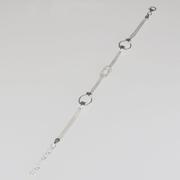 Nudo en el centro y como separadores, aros lisos de 11 mm de diámetro con estrellas. Pulsera de 17.5 cm de largo y 3 cm de alargador. Plata de ley de 925 milésimas.