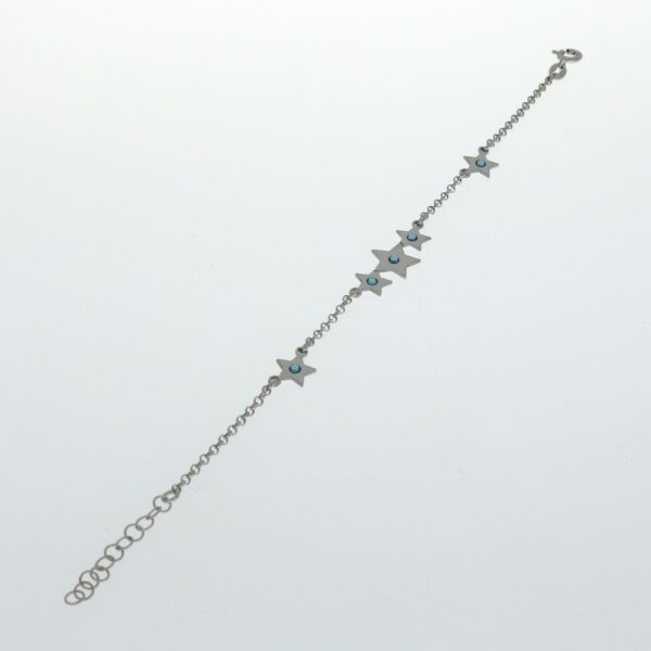 UncategorizedPulsera rodiada con cadena rolo de 2 mm. Tres estrellas con circonitas azules en el centro fijas de 9.60 mm y 8 mm iguales que las dos flores de los laterales.