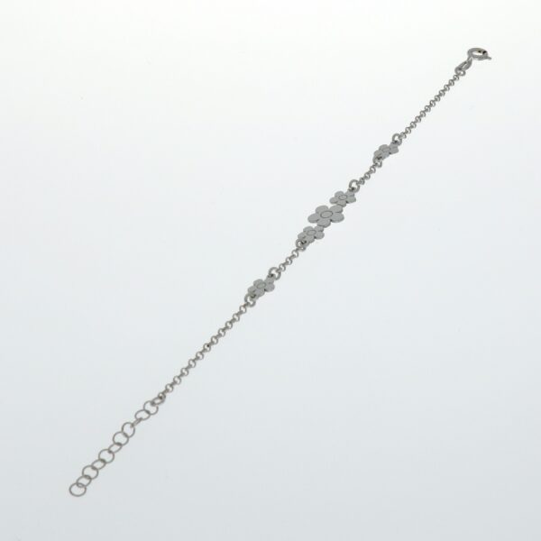 Pulsera rodiada con cadena rolo de 2 mm. Tres flores en el centro fijas de 9.10 mm y 6.65 mm iguales que las dos flores de los laterales.