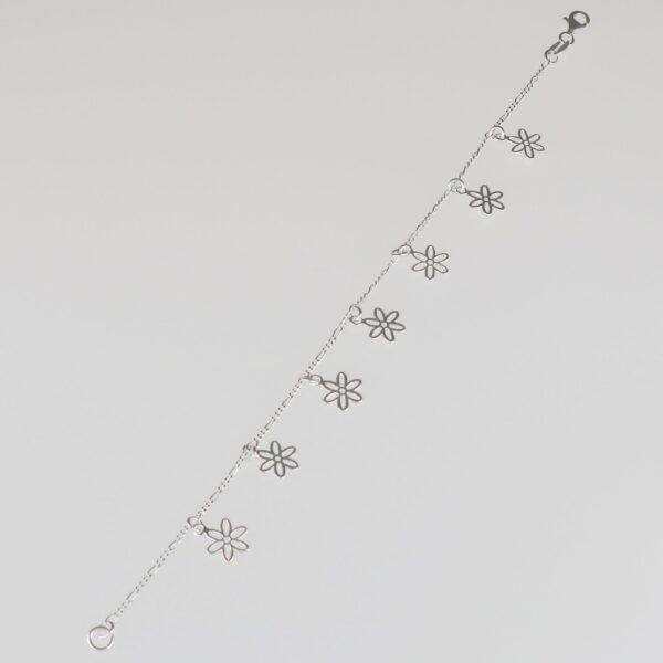 Pulsera con cadena programada 3 + 1 de 1.40 mm y flores caladas colgando de 8.23 mm. Pulsera de 18 cm de largo. Plata de ley de 925 milésimas.