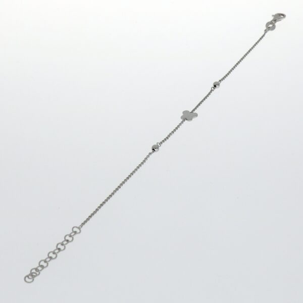 Pulsera rodiada con cadena rolo de 1 mm. Con mariposa en el centro de 5.75 mm.Pulsera de 17 cm de largo. Plata de ley de 925 milésimas