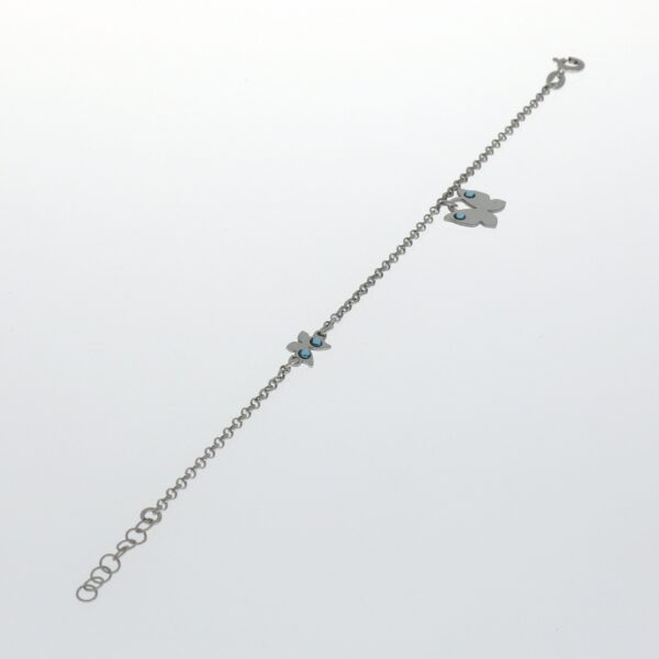 UncategorizedPulsera rodiada, con cadena rolo de 2 mm y mariposas lisas con circonitas de 2 mm. Pulsera de 16.5 cm de largo y 3 cm de alargador. Plata de ley de 925 milésimas.