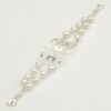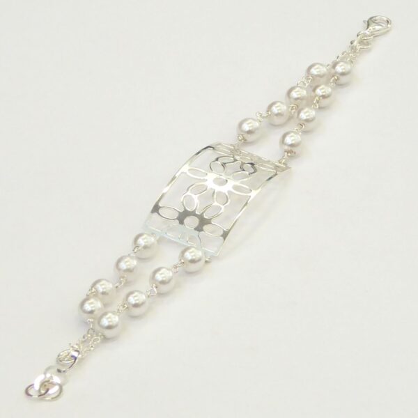 Pulsera de perlas de 6 mm con chapa labrada con flores de 4 cm por 2 cm de ancho. 18 cm de largo. Plata de ley de 925 milésimas.