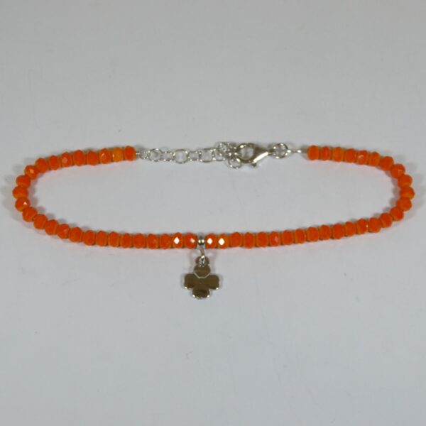 Pulsera de piedras facetada naranja.Con colgante de trébol de 8 mm . 16.5 cm de largo y 3 cm de alargador. Plata de ley de 925 milésimas.