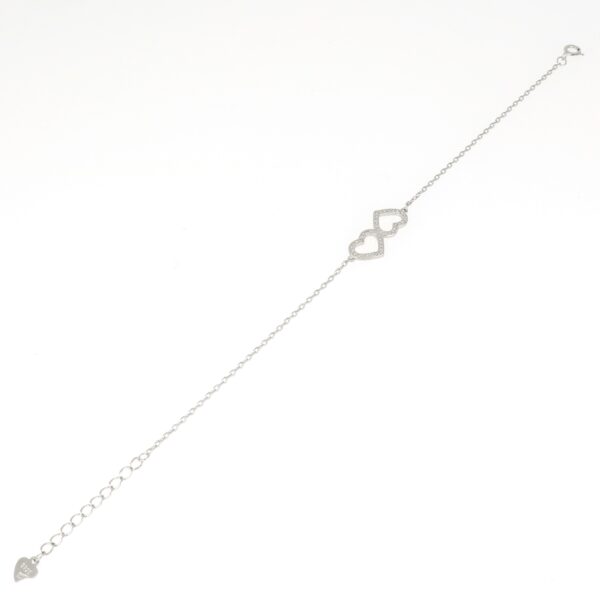 UncategorizedPulsera rodiada de cadena forzada de 1.30 mm. Con dos corazones de circonitas. 20 mm de largo y 8.85 mm de ancho.