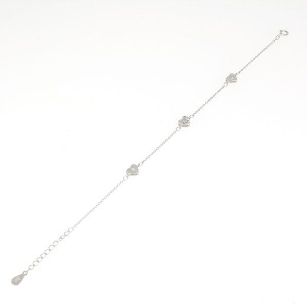 Pulsera rodiada de cadena forzada de 1 mm. Tres corazones de 5.85 mm con circonitas.