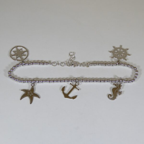 Pulseras, Sin piedrasPulsera de bolas de 3 mm . Con colgante lisos de brújula, ancla , timón , estrella y caballito de mar..De 14.50 mm de ancho y 15 mm de largo. Largo de la pulsera 18 cm y 3 cm de largo. Plata de ley de 925 milésimas.