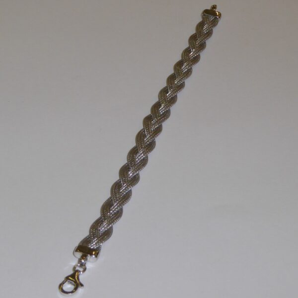 Pulsera rodiada de malla trenzada, con tres hilos planos. 20 cm de largo. Plata de ley de 925 milésimas.
