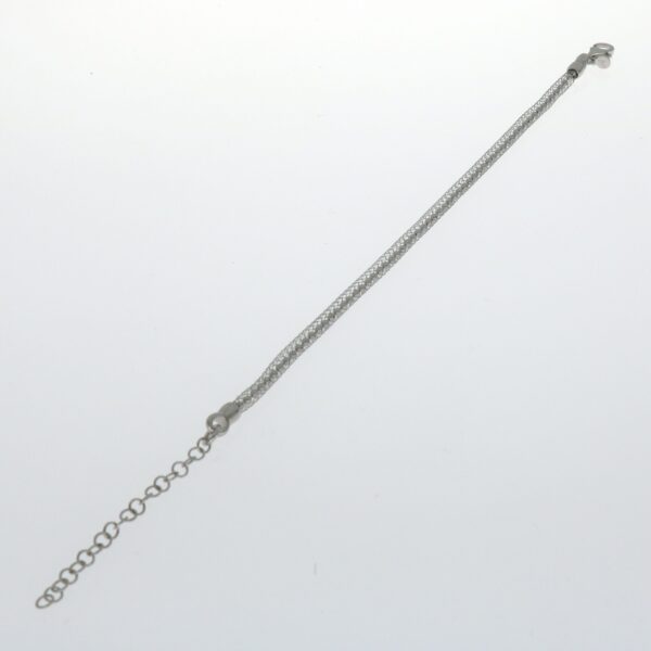 Pulsera de malla. Fina y flexible con bolas diamantadas de 2 mm. Pulsera de 18 cm de largo y 4 cm de alargador. Plata de ley de 925 milésimas.